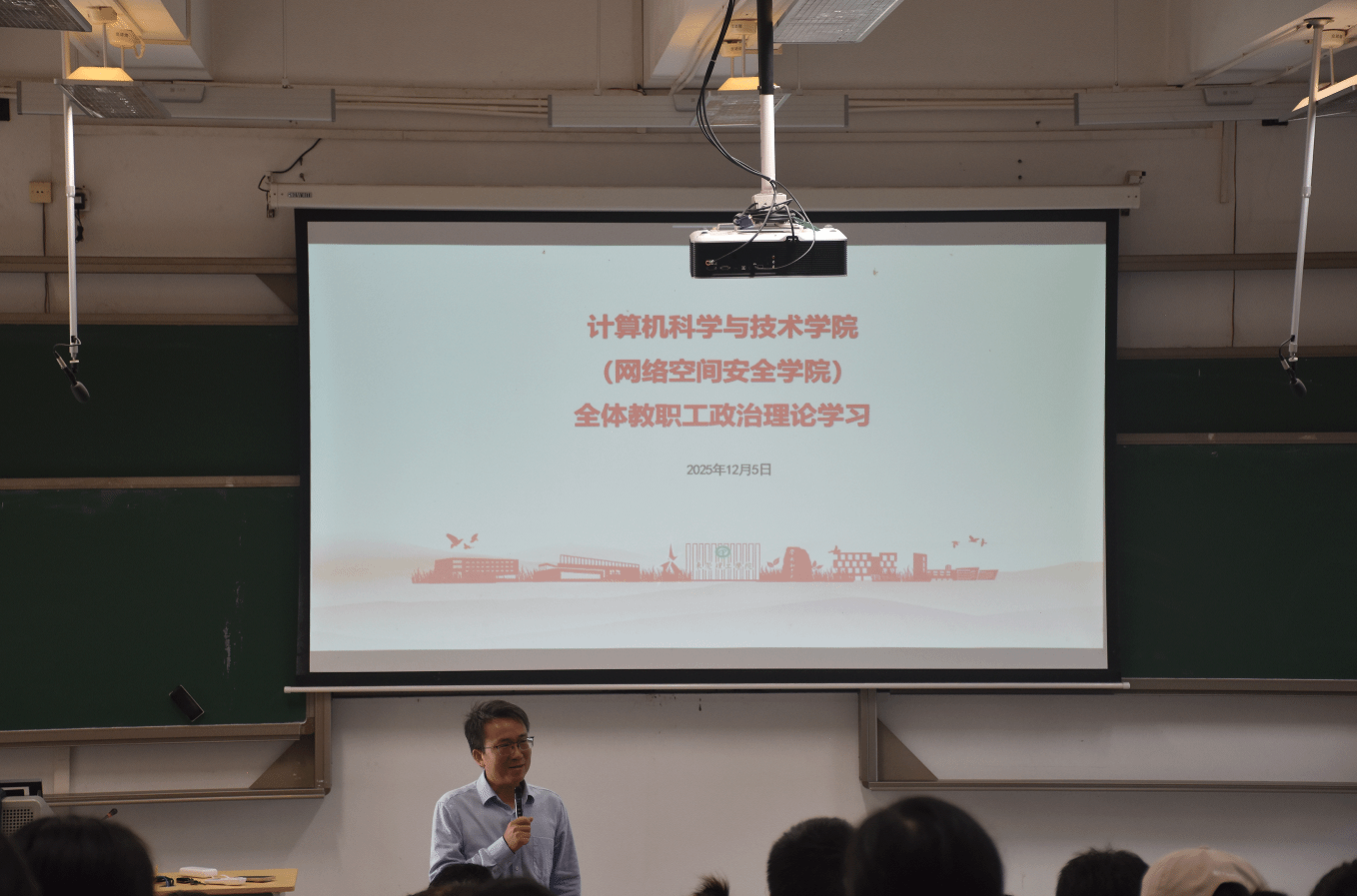 2025年12月5日下午,计算机学院在6E-208召开全体教职工政治理论学习会。本次会议旨在深入学习宣讲党的二十届四中全会精神与习近平总书记视察广东和出席第十五届全国运动会开幕式重要讲话精神,教育引导教师深刻领会其丰富内涵、核心要义和实践要求,不断增强对党的创新理论的政治认同、理论认同、情感认同。计算机学院党委书记刘群锋、院长袁华强出席并作报告。
