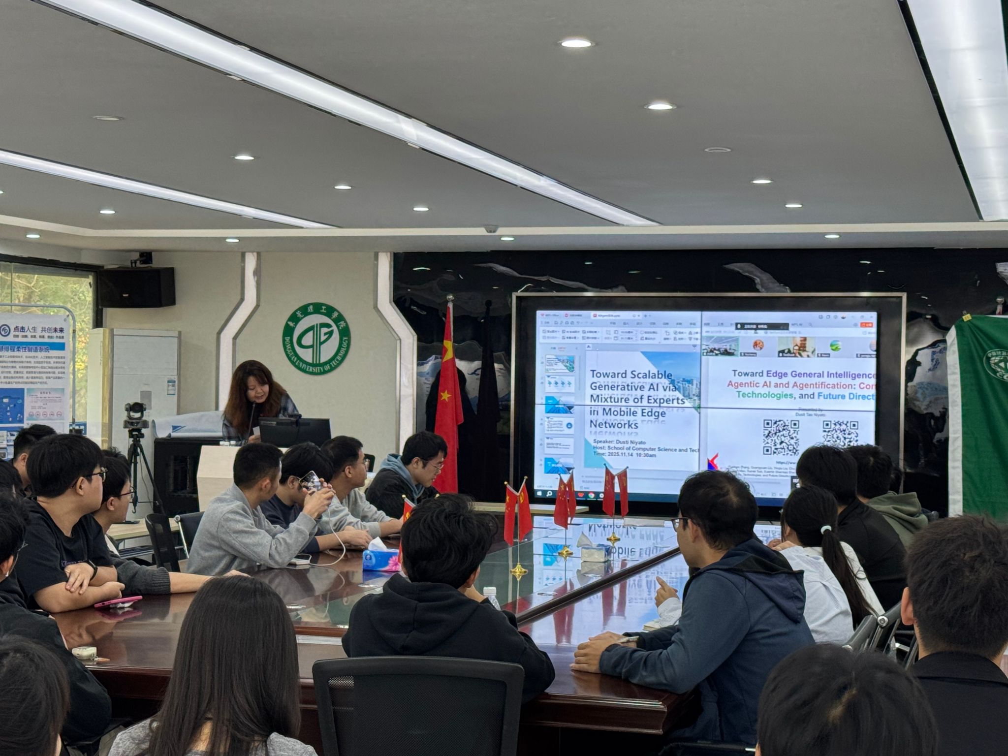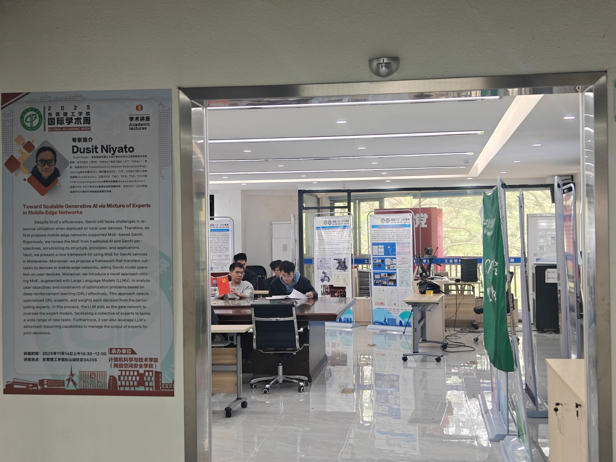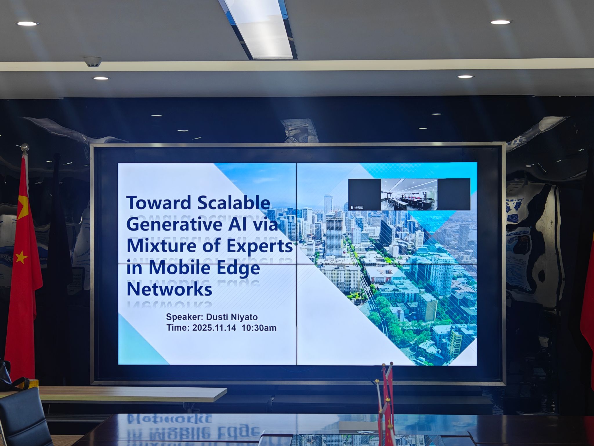 2025年11月14日,我院邀请新加坡南洋理工大学Dusit Niyato教授线上为国际学术周活动开展全英文学术报告,主题是"Toward Scalable Generative AI via Mixture of Experts in Mobile Edge Networks",整场报告会由计算机科学技术学院安妮老师主持,我院师生集中在计算机楼9A206会议厅听取报告。