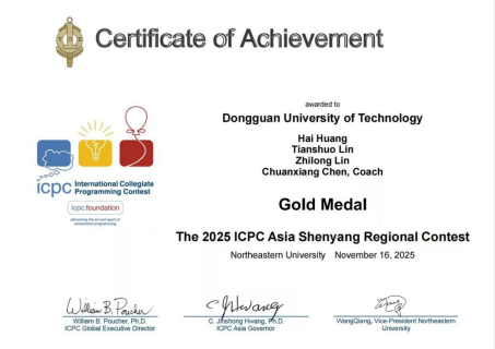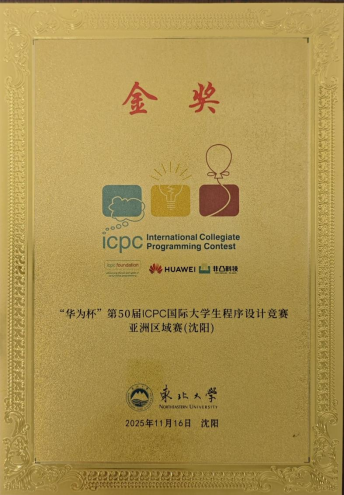 2025年11月16日,第50届ACM-ICPC国际大学生程序设计竞赛亚洲区域赛(沈阳)在东北大学圆满落幕。本次赛事吸引了北京大学、浙江大学、复旦大学、上海交通大学等237所高校的400支队伍同场竞技。我校计算机学院代表队(队员:黄海、林恬烁、林志龙;指导老师:陈传祥)凭借扎实的算法基础、敏捷的解题思路与稳定的临场发挥取得优异成绩,成功解出多道高难度赛题,勇夺金奖,实现了学院在该项赛事亚洲区域赛金奖上的历史性突破。
