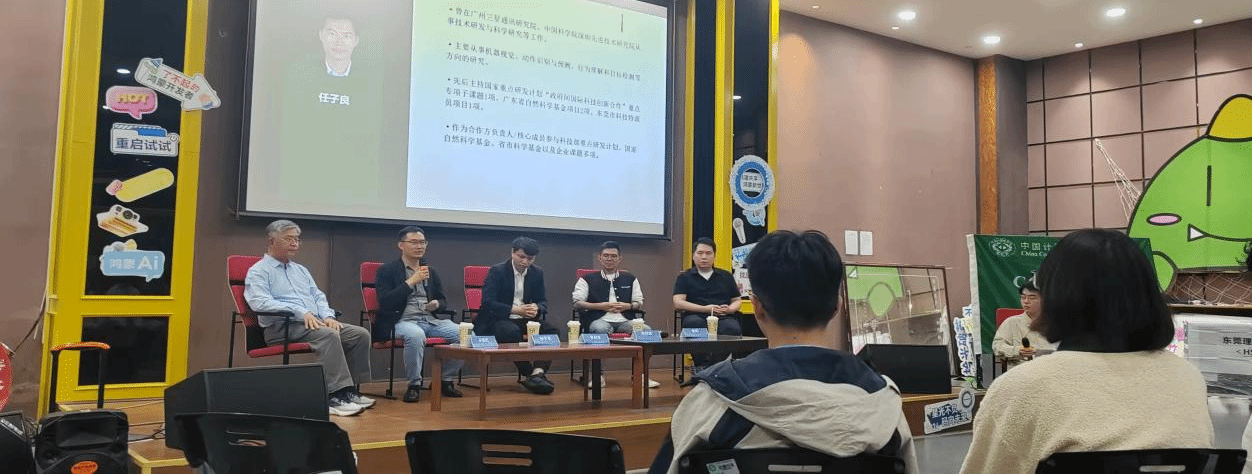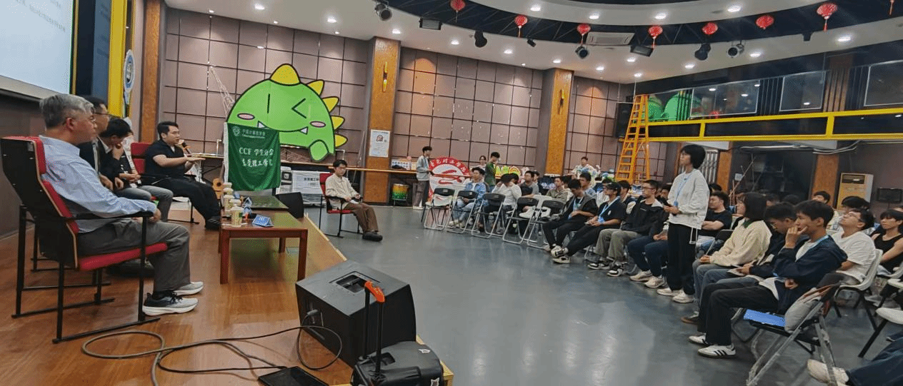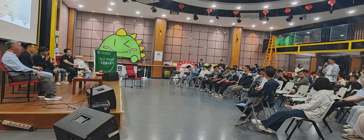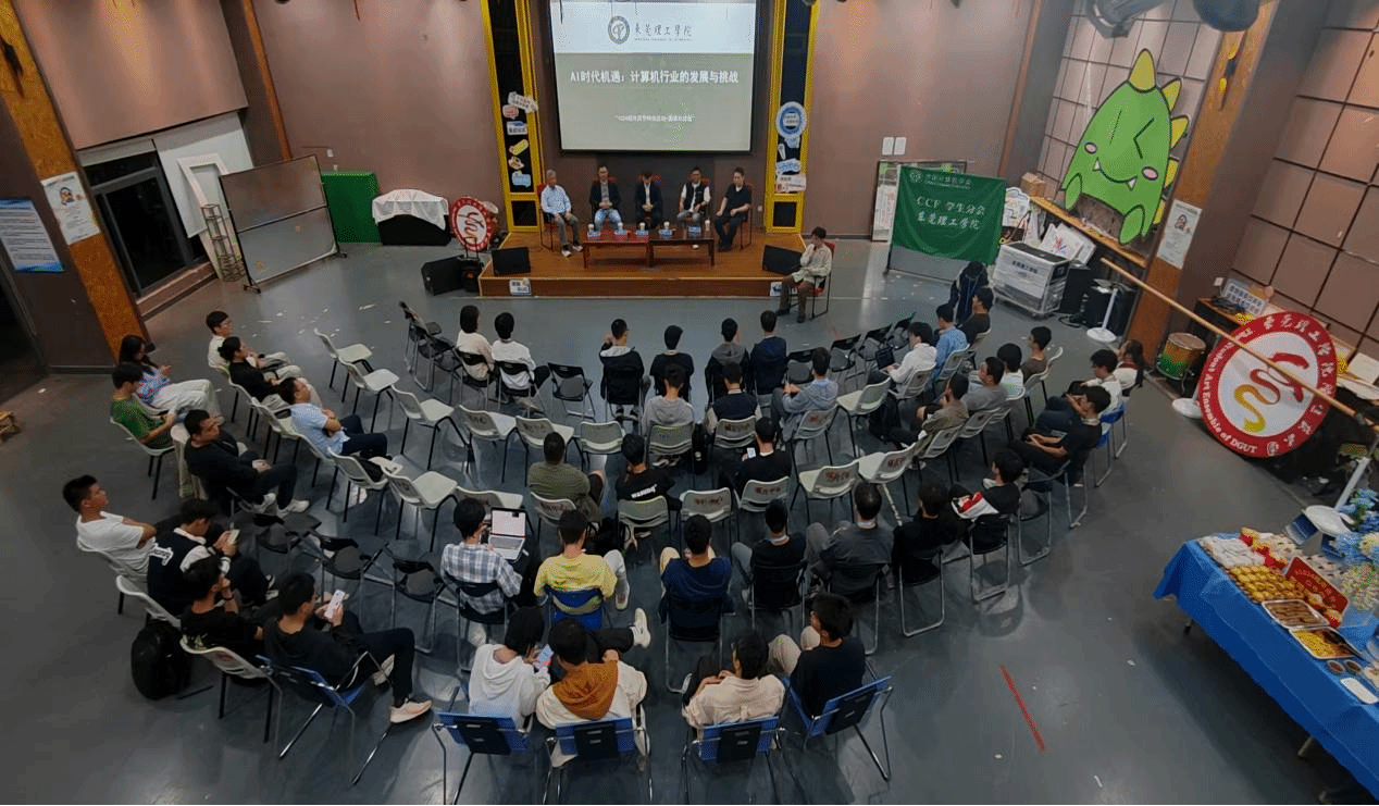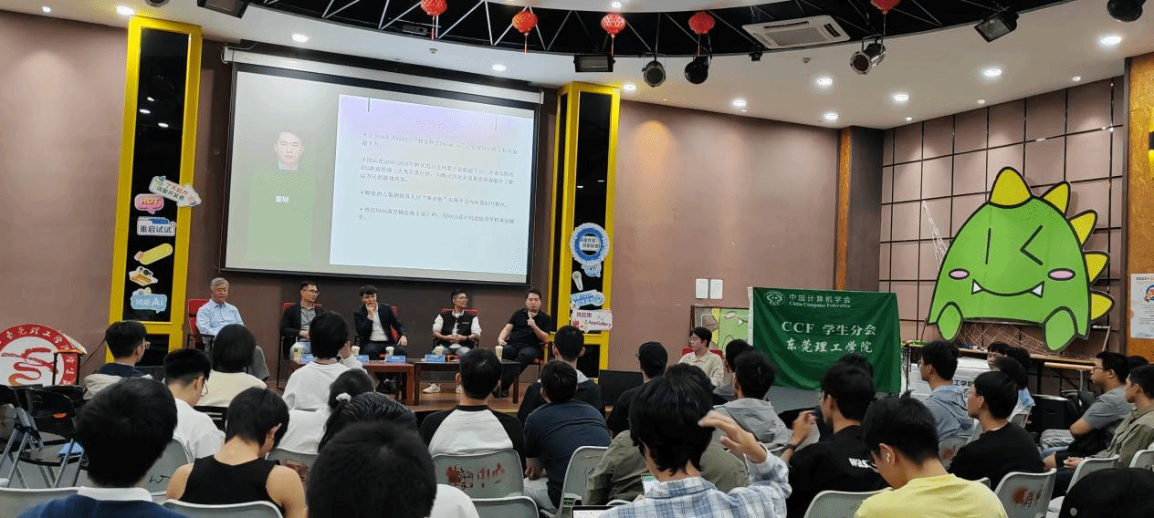 2025年10月24日,由CCF东莞理工学院学生学会组织了一场面向研究生与本科生的开放交流活动——AI圆桌夜活动,在东莞理工学院松山湖校区学生活动中心C栋(创享会)举行。东莞理工学院和大湾区大学的学生参加了本次研讨活动。粤台学院计算机科学与技术系凃保民主任、计算机学院任子良副教授、计算机学院副院长李蔚凌教授、深圳至简开发科技有限公司CEO兼CTO陈辉辉先生和躺赢科技(东莞)有限公司创始人&CEP童硕先生受邀参加本次活动。